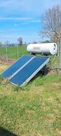 Kit pannelli produzione acqua calda sanitaria composto da n. 2 pannelli di cm. 100x200 spessore 11cm. Totale 4 mq. Bollitore Cordivari Interka solare da 300 lt. completo di protezione catodica con anodo al magnesio. E' montato su struttura inclinata per pavimenti piani ma può essere montato direttamente sul tetto. Il bollitore è praticamente nuovo in quanto è stato usato solo per 8 mesi.