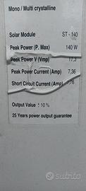 Kit pannello solare x camper o altro dove manca energia elettrica Composto: 1 pannello 1 inverter 3 kw uscita due prese 220v con protezione elettronica 1 carica batteria 15 a 1 convertitore entrata da 20v a 32 uscita 13v 30 a Caratteristiche pannelli vedi foto allegata Regalo un secondo pannello uguale con un terminale di uscita rotto da riparare Prezzo richiesto 250 eu Francesco 3389231908