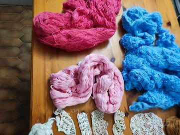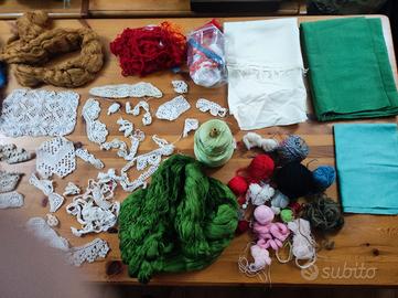 KIT COMPOSTO DA :N.5 matasse di cotone,scampoli di tessuto, lavoretti a maglia interrotti rocchetto di cotone e varie per un totale di 15 euro occasione