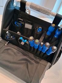 Mai usata. Nuova intoccata. Borsa professionale con manico in metallo, aperture a cerniera frontali, tasche laterali, tracolla. Kit 17 pezzi come da foto. Il kit comprende: 1 pezzo SDC3X60-PD----Buscapoli 1 pezzo SDC3X100-KV---Cacciavite 3x100 1 unità SDC3,5 x 100-KV---Cacciavite 3,5 x 100 1 pezzo SDC4X100-KV---Cacciavite 4x100 1 unità SDC5,5 x 125-KV---Cacciavite 5,5 x 125 1 pezzo SDC1PH-KV---Cacciavite PH1 1 pezzo SDC2PH-KV---Cacciavite PH2 1 pezzo SDC1PZ-KV---Cacciavite PZ1 1 pezzo SDC2PZ-KV---Cacciavite PZ2 1 unità UPC180-KV---Alicate 180 mm 1 unità SC5X---Forbici 1 unità FLS3--- nastro metrico 3 m. 1 unità KAK9---chiavi esagonali. 1 unità HB18---Cuter 1 unità HKS6 - Sega da tasca 1 unità LVL150---Livello 150 mm 1 pezzo HMR300 - Imbracatura