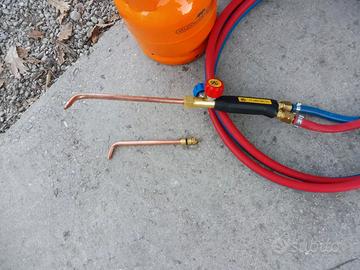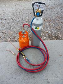 Kit saldatura autogena con , riduttori di pressione ossigeno con doppio manometro alta e bassa pressione e propano taratura fissa senza manometri , tre metri tubo binato già raccordato , cannello professionale leggero con 2 lance in dotazione . Completo di bombola da 5 ossigeno lt 2024 carica con certificato da collaudare nel 2034 e bombola da 1 kg propano carica .