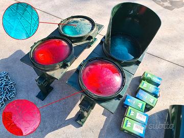 kit semaforo per muletti usato, si tratta di due semafori a due luci per regolare il passaggio dei muletti nei magazzini, dotati di 6 lampadine di ricambio, catena, quadro elettrico funzionante a 380v e 4 visori parasole ad incastro.