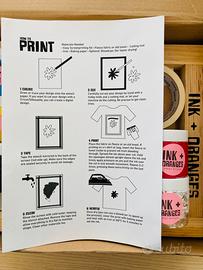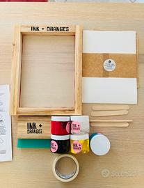 Vendo kit completo per serigrafia artigianale del brand australiano Ink + Oranges. Il set è nuovo, mai usato, ideale per chi vuole personalizzare t-shirt, borse e tessuti in modo professionale ma ecosostenibile. Questo non è il solito kit economico: è stato importato direttamente dall'Australia ed è progettato per essere 100% ecologico e sicuro. Telaio professionale in legno di alta qualità con rete già tesa. Squeegee (Spatola) in legno e gomma per stendere il colore. Set di colori atossici: inchiostri naturali e sicuri, non contengono sostanze chimiche nocive (perfetti anche per lavorare in casa). Sono molto brillanti e si possono mischiare per creare altri, di base la confezione ne include 4: bianco, nero, giallo e rosso. Carta per stencil speciale: 100% tree-free (senza alberi), impermeabile e riutilizzabile. Accessori: nastro adesivo per mascheratura, bastoncini in legno per miscelare e istruzioni originali.
