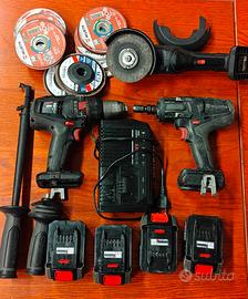 kit composto da avvitatore a impulsi (600nm), smerigliatrice 115mm, avvitatore a percussioni Power Combi (140nm), caricabatterie e 4 batterie da 5ah, in più tanti dischi da taglio, per legno, per piastrelle, per acciaio, ferro, per molatura etc.