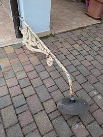 Lampada a braccio in ghisa con dettagli decorativi in rilievo risalente ai primi decenni del Novecento. Prodotto artigianale composto da tubo superiore (nel quale corre il cavo elettrico) e decoro fogliforme realizzato colando ghisa fusa in stampi in pietra refrattaria formati mediante stampi di legno.