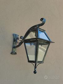 Lampada a braccio in ferro battuto pesante a 8 vetri, realizzata interamente a mano completa di vetri trasparenti ed impianto elettrico con portalampade grande E27, parte inferiore smontabile per cambio vetri e lampadina, si può utilizzare qualunque tipo di lampadina a risparmio energetico. Verniciatura adatta per esterno di colore nero con patinatura argento e trattamento anticorrosivo.