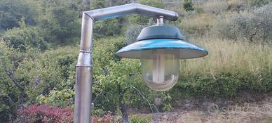 lampada da giardino d'epoca,era una lampada da vasca di tintoria,montata sopra un palo fatto con tubi di acciaio inox 316, fissabile a pavimento con tasselli con la flangia del palo,piatto della lampada da verniciare a piacimento.prezzo trattabile.