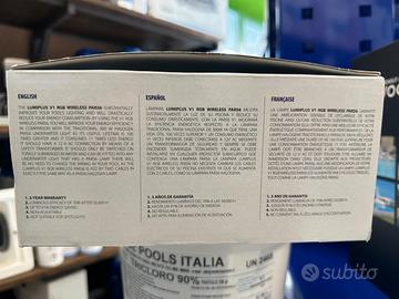 Il KIT 2 comprende 2 lampade Lumiplus PAR56 1.1 RGB Wireless 27W - 12V AC - 50 Hz - IPX8 + un radiocomando wireless a distanza LumiPlus Control motion, con cui si può selezionare il cambio di 12 colori ed 8 sequenze, velocità, spegnimento ed accensione.