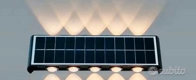 Lampada da esterno a energia solare, con doppia illuminazione verso l'alto e verso il basso per un effetto elegante e moderno. Si ricarica automaticamente durante il giorno e si accende al buio, senza bisogno di fili o corrente elettrica.