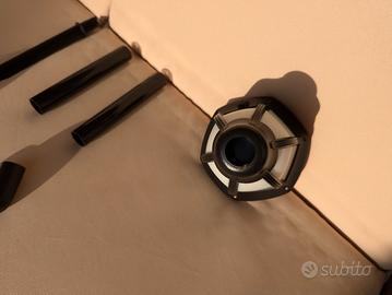 Ha vari pezzi aggiuntivi: da usare se si vuole impiantare nel terreno o fissare al muro con dei Fisher. C'é anche un angolo se lo si fissa su un muro verticale ed ha delle prolunghe per il "palo", tutto mostrato in foto.