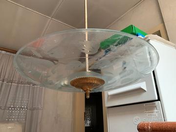Lampadario a sospensione mid century in vetro anni 50 con stelo in metallo e paralume in vetro con motivi floreali incisi. Diametro del vetro 50cm ca.