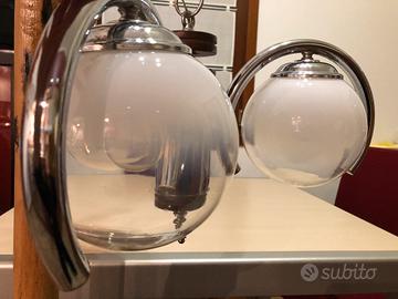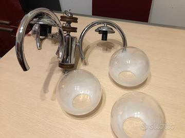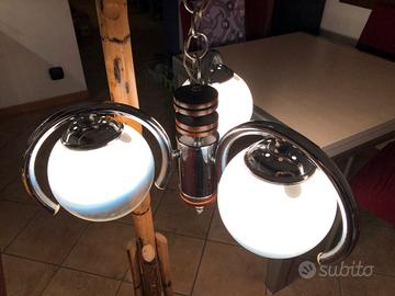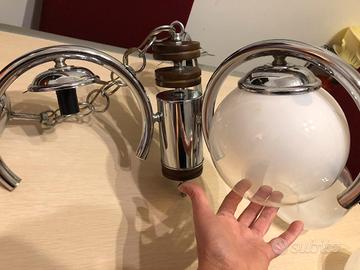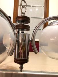 Vendo splendido lampadario vintage a tre bracci in acciaio cromato ed inserti in legno, con sfere bianco latte effetto sfumato.