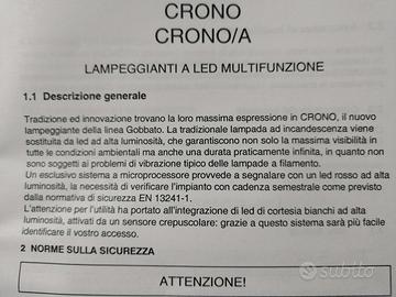 Vendo lampeggiante multifunzione a LED professionale marca Gobbato, modello CRONO/A, nuovo e mai installato (ancora nella sua confezione originale). Questo dispositivo è estremamente versatile perché compatibile con diverse tensioni di alimentazione, rendendolo adatto a quasi tutte le centrali per cancelli elettrici in commercio. Caratteristiche principali: Multitensione: Funziona sia a 230Vac che a 24Vac/Vdc. Antenna Integrata: Modello con antenna a 433.92MHz per migliorare la ricezione del telecomando. Tecnologia LED: Alta visibilità, bassi consumi e durata infinita (niente lampadine che si fulminano). Funzioni Extra: Include luce di cortesia bianca (sensore crepuscolare) e segnalazione per manutenzione programmata. Grado di protezione: IP54 (resistente alle intemperie). Ideale per sostituire vecchi lampeggianti a incandescenza o per nuovi impianti. Manuale di istruzioni incluso.