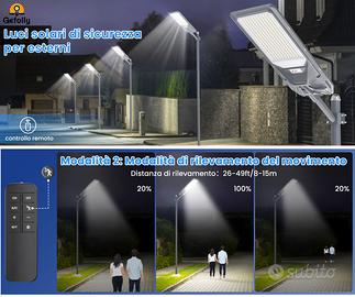 Si accende automaticamente al crepuscolo e si spegne all'alba, ampia copertura fino a 3300 m². Dispone di sensore di movimento, due modalità di illuminazione e regolazione della luminosità tramite telecomando incluso.