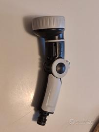 Pistola o lancia da irrigazione per il tubo dell'acqua del giardino. Ha diverse modalità di getto d'acqua. È nuova. Grigia e nera.