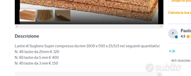 Sughero super compresso ancora confezionate adatte per coibentazioni termiche e acustiche, in lastre da cm 100 x 50 nei seguenti spessori e quantitativi: