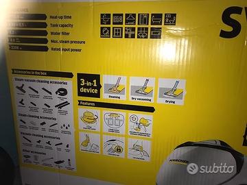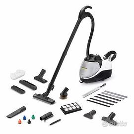La confezione include: pulitore a vapore con aspirazione Kärcher SV 7, kit pavimenti, bocchetta manuale con accessori vari, ugello vapore, antischiuma "FoamStop", misurino, spazzola e sacca accessori. Sicurezza bambini. Foto prese dal web perche confezione mai aperta.