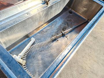 lavatoio doccetta con vascone usato, si tratta di un lavatoio con unico vascone in acciaio inox dotato di ripiano inferiore, alzatina e doccetta. dimensioni: 160X70cm h92cm, vasca 140X50cm h36cm