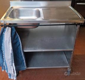 Lavello in acciaio con ruote, con struttura porta tanica acqua.