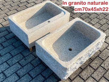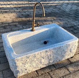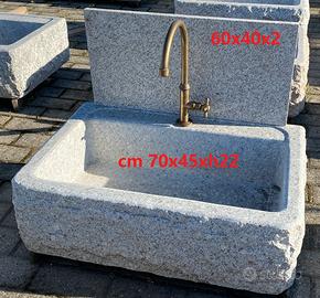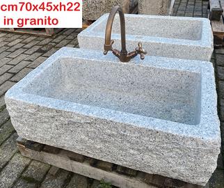 E' scavato da un massello di granito grigio o rosa naturale, è molto più resistente e durevole del marmo e della pietra. Non è di cemento, graniglia o polvere di marmo. Non soffre il gelo ed è ideale sia per interni che per esterni.