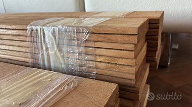 Vendo 32 listelli in teak da 9 cm (largh) 2 (spess) 181 cm (lungh), in tutto poco più di 5,2 mq; sono l’avanzo della posa di un decking esterno, nuovi e ancora nel loro imballo, come visibile da foto.