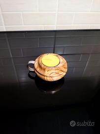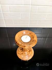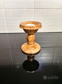 Porta candela in legno di ulivo realizzata a mano su tornio, monta candele fino a 36mm di diametro, altezza 11,5cm. Finitura lucida