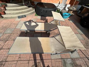 Vendo set di 2 lettini mare usati. Condizioni discrete. Uno dei due lettini presenta qualche piccola striatura sulla parte finale (visibile in foto).