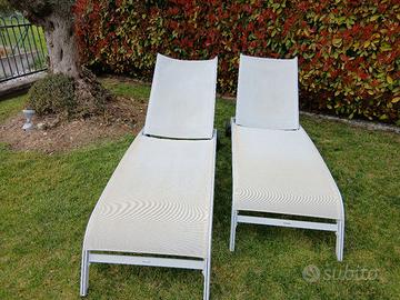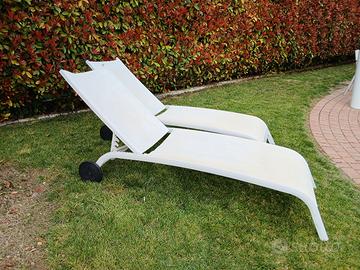 Due lettini prendisole con ruote e schienale reclinabile.Il tessuto e' leggermente ingiallito e sono presenti piccoli segni d'usura.