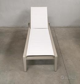 Lettino da giardino Higold Milano realizzato in textilene imbottito. Questo materiale innovativo sostituisce la tradizionale cuscineria, offrendo comfort e praticità senza pari. La struttura in alluminio verniciato a polvere garantisce durabilità e leggerezza, mentre i braccioli in legno teak aggiungono un tocco di calore naturale al design complessivo.