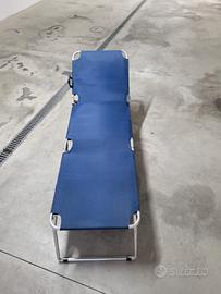 Vendo per inutilizzo lettino in tessuto blu e alluminio in buone condizioni, la struttura non presenta difetti e non è rotta, il tessuto è integro, solo un po' scambiato dal sole. Prezzo trattabile se interessati