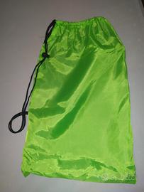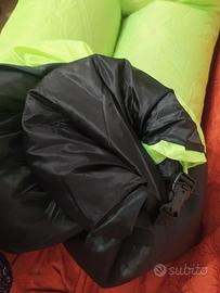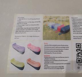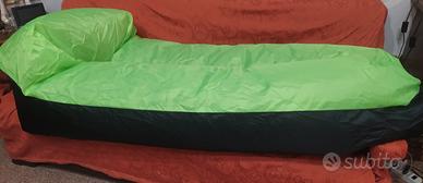 Lettino/divano gonfiabile ad aria utilizzabile in tanti modi,come lettino sulla spiaggia, gonfiabile galleggiante in mare, in campeggio, Pic nic ecc. Per poterlo utilizzare basta agitarlo in aria tenendo aperta l' apertura e con una rincorsa far entrare l'aria all' interno, anche con compressore, poi sigillare con la chiusura a scatto. In pochi secondi si può avere un lettino/divano gonfiabile già pronto per essere utilizzato, compreso di istruzioni. Sgonfio si ripone in una sacca a tracolla in dotazione per essere trasportato facilmente. Nuovo, mai utilizzato, solo provato a gonfiarlo, cedo per inutilizzo. Modello con cuscino incorporato più confortevole, che costa di più rispetto agli altri modelli, pagato 25 €.