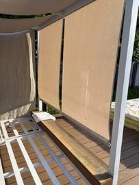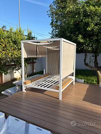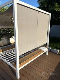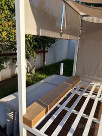Letto da giardino con gazebo e tende – stile lounge (tipo Bali bed) Letto da esterno tipo “Bali bed” con struttura in metallo bianco e inserti effetto legno. Completo di tende laterali avvolgibili, ideali per regolare ombra e privacy. Perfetto per giardino, terrazzo o zona piscina. Nuovo costa circa 550–600€. Condizioni buone: struttura solida e integra, tende con normali segni d’uso ma ancora perfettamente funzionali. Design moderno ed elegante, ideale per creare una zona relax all’aperto. 📍 Ritiro a mano