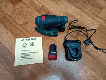 Smerigliatrice a delta ricaricabile 12V Parkside completa di batteria serie X 12V Team, caricabatterie, kit fogli carta abrasiva nuovi e pratica valigetta per il trasporto.