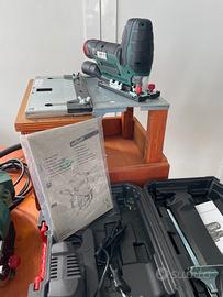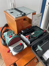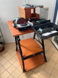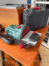 Levigatrice circolare da banco con posizione anche verticale montata su banco insieme ad un seghetto alternato a batteria completo di supporto per il taglio da banco.