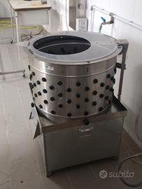 Vendo linea/attrezzatura completa per lavorazione pollame in acciaio inox, ideale per allevamenti e agriturismi. Soluzione completa per organizzare le fasi di lavorazione (come da foto), composta da: spiumatrice/spennapolli a tamburo con dita in gomma, vasca bagnatura/scottatura (4 kW), dissanguatore a 4 coni, guidovia aerea ad anello con ganci, lavello inox con doccetta, sterilizzatore coltelli, vasca raccolta visceri e accessori vari.