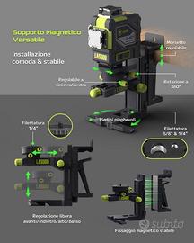Versatile Design della staffa: Fissata alla staffa, la livella laser LG-4Ds può essere facilmente ruotata per soddisfare qualsiasi angolo desiderato. La staffa multifunzionale consente di effettuare regolazioni da fronte a retro e da sopra a sotto. Può essere fissata magneticamente alle superfici metalliche, appesa alle pareti o fissata ai piani dei tavoli. La base magnetica è dotata di filettature da 1/4“ e 5/8”, per garantire la compatibilità con vari treppiedi e strumenti di montaggio