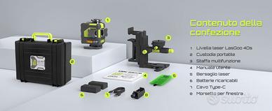 Pacchetto incluso: 1 livella laser LasGoo LG-4Ds, 2 batterie ricaricabili agli ioni di litio da 2600 mAh, 1 staffa magnetica, 1 morsetto per finestra, 1 piastra di puntamento laser, 1 cavo di ricarica Type-C, 1 custodia rigida