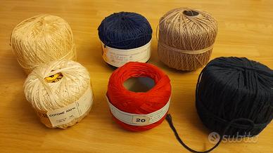 Lotto assortito di 41 gomitoli di varie metrature e colori, molti dei quali ancora integri o quasi completi. Sono tutti di puro cotone pregiato tranne i due argento che sono in acetato/poliestere, varie marchi di eccellenza: Phildar (Relais), Adriafil (Cheope), Luxor, Pellicano, Sesia....gamma di colori dai toni neutri (beige, panna, bianco) a colori vivaci (giallo ocra, rosso, corallo, azzurro), fino a toni scuri (blu notte, verde bosco, nero). Alcuni gomitoli sono nuovi con fascetta originale, altri sono iniziati ma in ottime condizioni