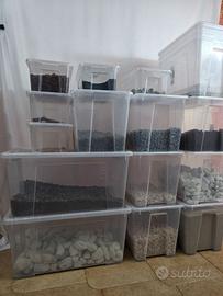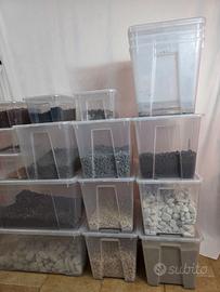 Grandi quantità di sabbie, ghiaie e sassolini, terricci e substrati tecnici, corteccia, legni, muschi stabilizzati.