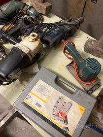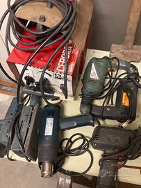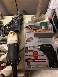 Vendo causa inutilizzo lotto in blocco, presenti 4 trapani (quello AEG non parte sempre), 1 saldatrice Cebora con maschera (funzionante ma con vernice rovinata) 2 mazze, 2 levigatrici (1 non si accende) 1 oliatore, 1 flessibile grosso, uno stagnatore e uno “fon” industriale No spedizione, prezzo non trattabile