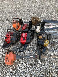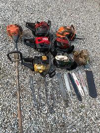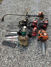 Lotto di macchine a scoppio, 6 motoseghe, i decespugliatore e 1 pompa acqua, le motoseghe hanno barra e catena ogni una, alcune funzionanti, ideale per ristoro o pezzi di ricambio