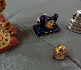 Lotto piccoli soprammobili vintage decorativi. Molto bella la macchina per cucine di Limoges, purtroppo ha un piccolo difetto visibile in foto, ma è comunque molto bella. Fiore all'occhiello è però la piccola riproduzione in ottone di un orologio sveglia, davvero microscopico, bellissimo. Oggetti in buono stato conservativo e molto particolari!