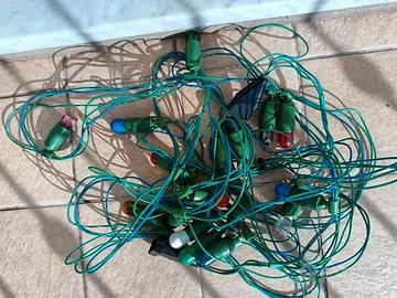 Vendo un lotto natalizio. Casette per il presepe, addobbi per l'albero e luminarie da esterno. Tutto usato, in condizioni da discrete a molto buone. Il lotto include una decina di casette (costruite in compensato, carta e cartone; altezze tra 4 e 12 centimetri); due castelli (alti 17 centimetri, larghi 14 e 9 centimetri); un mulino con pala rotante (in compensato, alto 18 centimetri e lungo 23); due ponti, in compensato e metallo, di carta, lunghi 18 e 17 centimetri. Gli articoli di compensato sono artigianali: creati, da mio padre, con la tecnica del traforo. Nel lotto anche festoni argentati e rossi, palline di plastica di varie dimensioni e colori, pigne argentate e addobbi artigianali (scatoline di carta argentate); una campanella argentata alta 10 centimetri; tre luminarie multicolori, usate, ma funzionanti.