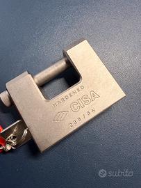 Lucchetto corazzato monoblocco CISA 28550.84 (84 mm) Lucchetto di alta sicurezza CISA, modello 28550.84, progettato per garantire la massima protezione in contesti ad alto rischio. Realizzato con corpo monoblocco in acciaio carbonitrurato con trattamento anticorrosione e arco in acciaio cementato, offre un’elevata resistenza ai tentativi di effrazione. È dotato di cilindro sostituibile e piastrina di protezione del cilindretto, caratteristiche che aumentano ulteriormente il livello di sicurezza e la durabilità nel tempo. Ideale per la protezione di serrande, porte blindate e accessi che richiedono prestazioni elevate in termini di sicurezza