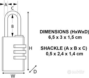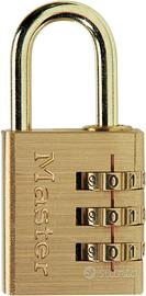Lucchetto a combinazione a 3 cifre con corpo in alluminio massiccio da 30 mm con finitura in ottone e archetto in acciaio cromato.