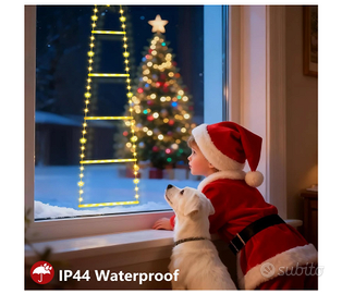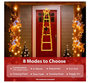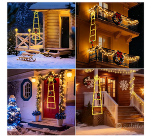 Vendo Luce di natale da esterno 1 metro , scala con stella e babbo natale a batteria. Nuovo con scatola e accessori. La luce è a forma di scala lunga 1 metro circa . Si va a stringere verso l'alto dove ci sono 2 stelle in cima . Compreso un piccolo babbo natale che si arrampica . La luce e bianco caldo con 8 effetti di colore . Funziona a batterie 3 AA non incluse. Adatto per l'esterno, da attaccare su una porta , finesta , balcone , alberi , grate , scale , giardino etc . Essendo a batteria non necessità di alimentazione elettrica . Misura esattamente 1 metro fino alle stelle che sono altri 30 cm circa . La base è 26 cm e la parte alta più stretta 16 cm . Ha 94 led e si illumina tutta anche le scalette e le stelle. Decorazione molto bella e con bell'effetto scenico. La durata della batteria è molto ampia. Si può anche regolare un timer per l'accensione e lo spegnimento. Adatto per casa , negozi , uffici , magazzini , hotel , bar , ristoranti, locali , centri commerciali etc