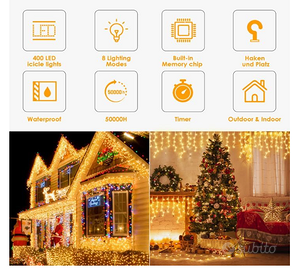 Luci di Natale da Esterno : La tenda luminosa esterna da 10M di 400 LED luminose, utilizzando i cavi trasparenti. Ci sono un totale di 80 catene luminose cadenti, ciascuna con una lunghezza cadente di 0,3 m, 0,7 m, 0,4 m e 0,6 m come gruppo. Formando un bellissimo arco, che creano un'atmosfera più accogliente per la tua case