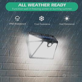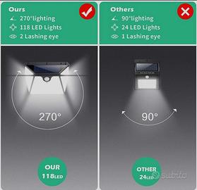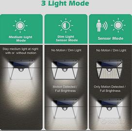 Nuove MAI USATE , vendo causa inutilizzo . Luci Solari da Esterno con 3 Modalità di intensità di luce . La luce si accende al passaggio sotto il sensore . Raggio di luce di 270 Gradi e potenza di una singola lampada è di 100 Watt . Nella confezione due lampade ### L'oggetto si trova a ROMA in zona ALESSANDRINO CENTOCELLE