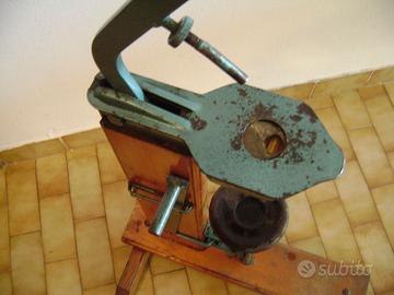 Macchina per imbottigliare risalente agli anni 60 circa, funzionante. Dimensioni: altezza 86 cm compreso il braccio soprastante abbassato; lunghezza della base in legno 63,5 cm, 77 cm compreso il braccio; larghezza massima (piedi della base) 43 cm; diametro della base dove si appoggia la bottiglia 13 cm.
