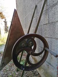 Vecchia macchina macina uva in ferro con ingranaggi a manovella. Per maggiori informazioni contattatemi.